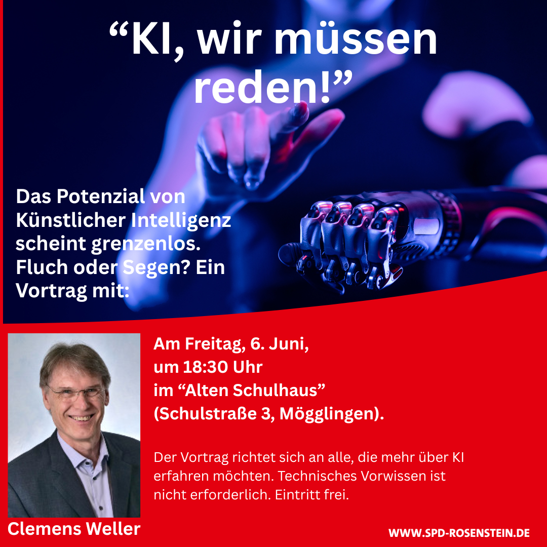 Am Freitag, den 6. Juni, um 18:30 Uhr lädt die SPD-Rosenstein zur Veranstaltung ins „Alte Schulhaus“ (Schulstraße 3) in Mögglingen ein. Unter dem Motto „KI, wir müssen reden“ widmet sich der Ortsverein einem der spannendsten Themen unserer Zeit: Künstliche Intelligenz. Gemeinsam soll ein Blick auf die Chancen und Risiken dieser Technologie, die unseren Alltag zunehmend prägt, geworfen werden. Moderiert von Clemens Weller steht eine interaktive Diskussion mit ChatGPT im Mittelpunkt – eine spannende Gelegenheit, mehr über KI zu erfahren und Fragen zu stellen. Für alle, die neugierig sind, technische Vorkenntnisse sind nicht erforderlich. Die SPD freut sich auf einen interessanten Abend mit guten Gesprächen! Der Eintritt ist frei.